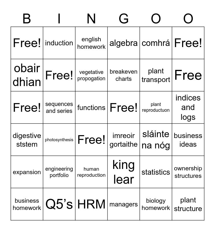 This bingo card has 36 words: king lear, human reproduction, managers, obair dhian, digestive ststem, Free!, Free!, HRM, comhrá, statistics, Free, algebra, ownership structures, sequences and series, breakeven charts, Free!, expansion, plant reproductuon, Free!, english homework, functions, photosynthesis, imreoir gortaithe, Free!, sláinte na nóg, induction, plant transport, Q5’s, vegetative propogation, Free!, plant structure, business homework, business ideas, indices and logs, engineering portfolio and biology homework.