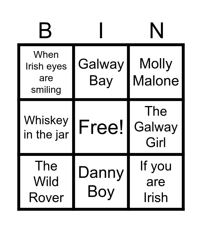 This bingo card has a free space and 10 words: Danny Boy, Molly Malone, When Irish eyes are smiling, If you are Irish, Whiskey in the jar, The Wild Rover, Galway Bay, I'll tell me ma, The Galway Girl and Drunken Sailor.