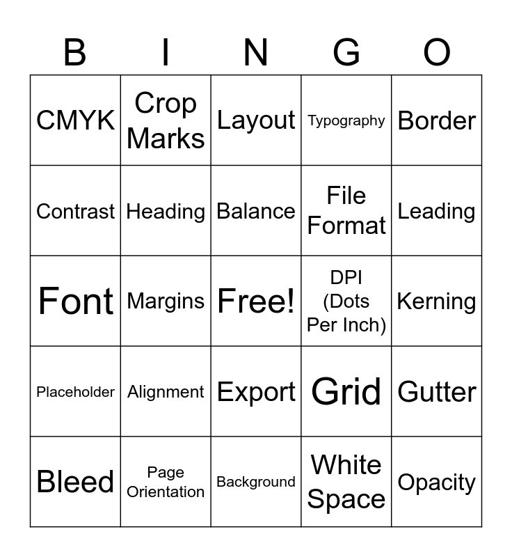 This bingo card has a free space and 25 words: Alignment, Background, Balance, Bleed, Border, CMYK, Contrast, Crop Marks, DPI (Dots Per Inch), Export, File Format, Font, Grid, Gutter, Heading, Justification, Kerning, Layout, Leading, Margins, Opacity, Page Orientation, Placeholder, Typography and White Space.