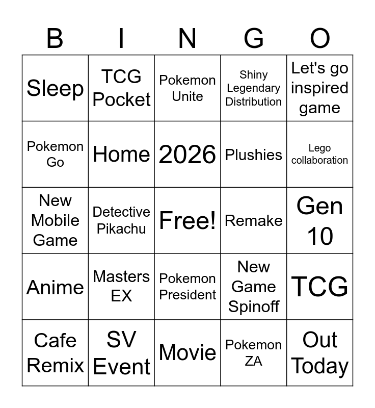 This bingo card has a free space and 24 words: Masters EX, SV Event, 2026, Cafe Remix, Let's go inspired game, Sleep, Pokemon Go, TCG Pocket, Remake, Pokemon President, Plushies, New Mobile Game, New Game Spinoff, TCG, Home, Pokemon ZA, Gen 10, Pokemon Unite, Lego collaboration, Detective Pikachu, Out Today, Anime, Shiny Legendary Distribution and Movie.