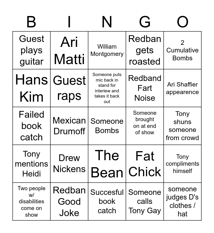 This bingo card has a free space and 24 words: Drew Nickens, Redban Good Joke, Someone puts mic back in stand for interiew and takes it back out, Two people w/ disabilities come on show, 2 Cumulative Bombs, Guest plays guitar, Hans Kim, Ari Matti, Someone brought on at end of show, The Bean, Redband Fart Noise, Failed book catch, Fat Chick, Tony compliments himself, Guest raps, Someone calls Tony Gay, Tony shuns someone from crowd, William Montgomery, Ari Shaffier appearence, Mexican Drumoff, someone judges D's clothes / hat, Tony mentions Heidi, Redban gets roasted and Succesful book catch.