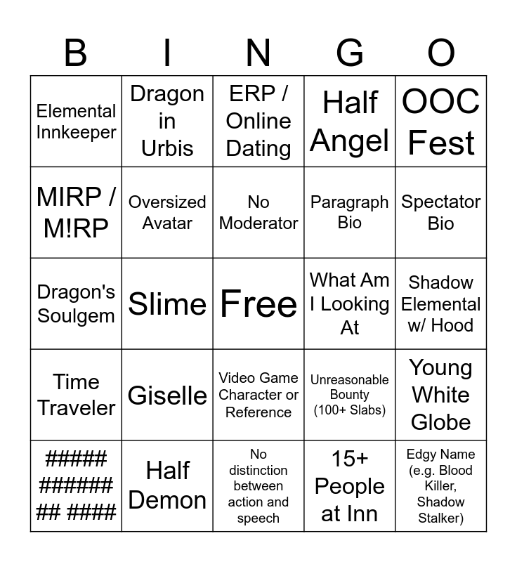 This bingo card has a free space and 24 words: Giselle, Half Demon, No Moderator, ##### ###### ## ####, OOC Fest, Elemental Innkeeper, MIRP / M!RP, Dragon in Urbis, What Am I Looking At, Video Game Character or Reference, Paragraph Bio, Dragon's Soulgem, Unreasonable Bounty (100+ Slabs), Young White Globe, Oversized Avatar, 15+ People at Inn, Shadow Elemental w/ Hood, ERP / Online Dating, Spectator Bio, Slime, Edgy Name (e.g. Blood Killer, Shadow Stalker), Time Traveler, Half Angel and No distinction between action and speech.