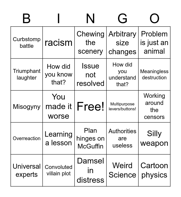 This bingo card has a free space and 40 words: Colour bleed, Misogyny, Racism, How did you know that?, Convoluted villain plot, Plan hinges on McGuffin, Issue not resolved, Problem is hero/bystander fault, Problem is just an animal, Overreaction, You made it worse, Arbitrary size changes, Cartoon physics, Working around the censors, Multipurpose levers/buttons!, Learning a lesson, Hero sadism, Curbstomp battle, Arbitrary stupidity, Chewing the scenery, Silly weapon, Weird Science, How did you understand that?, Triumphant laughter, Obvious political commentary, Ancient secrets, Animal mascot hijinks, Animal as a weapon, Hidden villain/sudden betrayal, Evil face, Explains the plan, Universal experts, Reset button, Authorities are useless, Meaningless destruction, Damsel in distress, Hokey speech/dialogue, All your eggs in one McGuffin, racism and Hokey phrase.