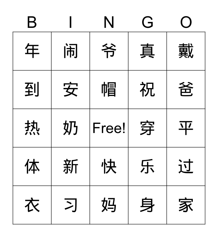 This bingo card has a free space and 24 words: 新, 习, 帽, 衣, 戴, 年, 到, 闹, 穿, 快, 祝, 热, 乐, 过, 安, 身, 平, 爷, 爸, 奶, 家, 体, 真 and 妈.