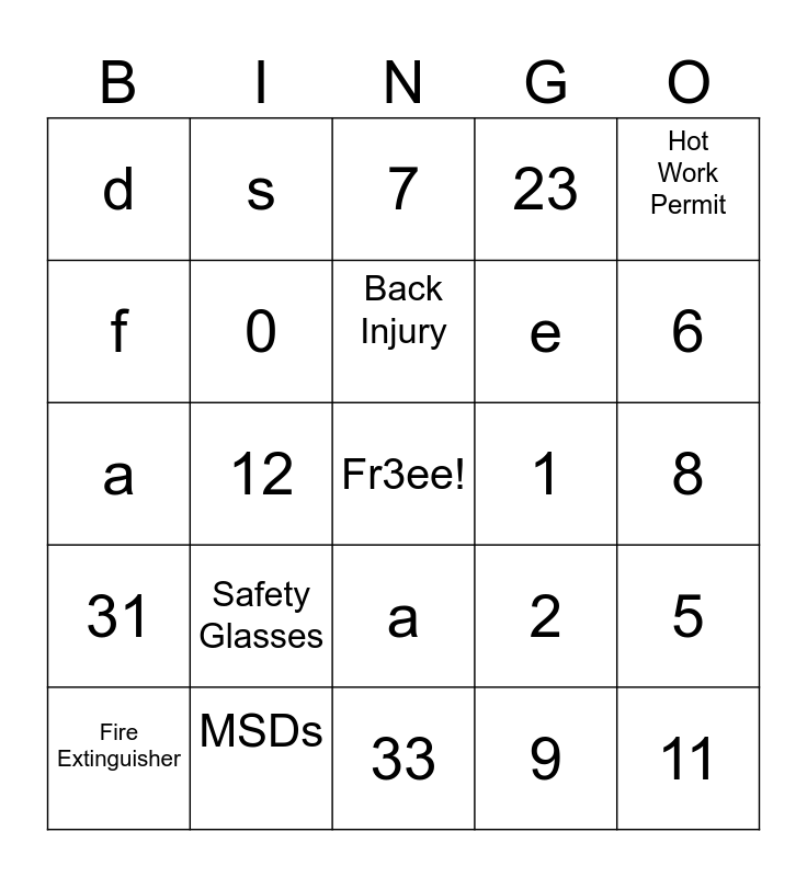 This bingo card has a free space and 24 words: Safety Glasses, MSDs, Back Injury, Fire Extinguisher, Hot Work Permit, d, f, s, 1, a, e, a, 2, 5, 0, 9, 8, 7, 6, 12, 11, 31, 23 and 33.