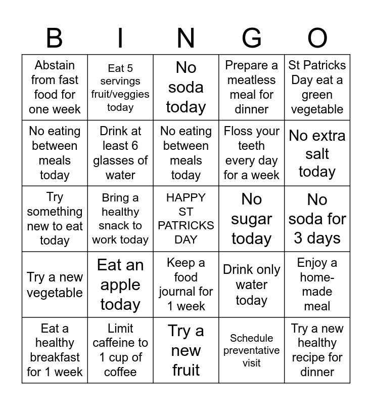 This bingo card has a free space and 25 words: Eat an apple today, Try a new fruit, No eating between meals today, Eat a healthy breakfast for 1 week, St Patricks Day eat a green vegetable, Abstain from fast food for one week, No eating between meals today, Eat 5 servings fruit/veggies today, No sugar today, Keep a food journal for 1 week, Floss your teeth every day for a week, Try something new to eat today, Drink only water today, Enjoy a home-made meal, Drink at least 6 glasses of water, Try 100%natural green tea, No soda for 3 days, No soda today, No extra salt today, Bring a healthy snack to work today, Try a new healthy recipe for dinner, Limit caffeine to 1 cup of coffee, Try a new vegetable, Prepare a meatless meal for dinner and Schedule preventative visit.
