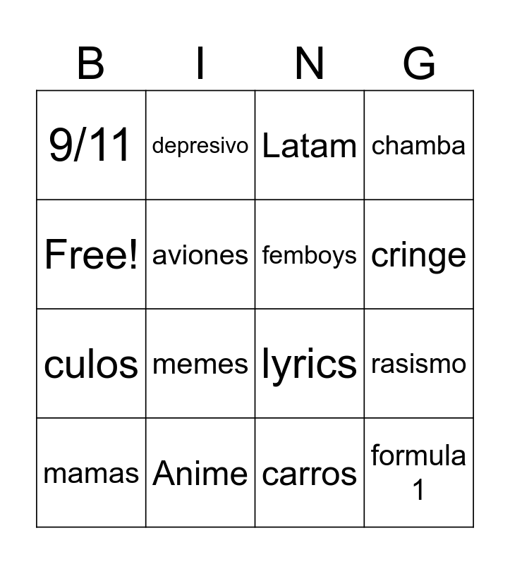 This bingo card has 16 words: Anime, rasismo, Latam, 9/11, culos, depresivo, lyrics, carros, Free!, aviones, mamas, chamba, memes, cringe, femboys and formula 1.