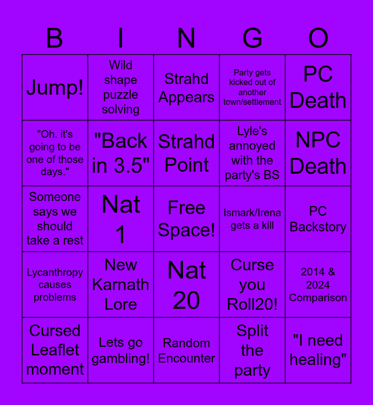 This bingo card has a free space and 24 words: New Karnath Lore, Lets go gambling!, Strahd Point, Cursed Leaflet moment, PC Death, Jump!, "Oh. it's going to be one of those days.", Wild shape puzzle solving, Ismark/Irena gets a kill, Nat 20, Lyle's annoyed with the party's BS, Someone says we should take a rest, Curse you Roll20!, 2014 & 2024 Comparison, "Back in 3.5", Split the party, PC Backstory, Strahd Appears, NPC Death, Nat 1, "I need healing", Lycanthropy causes problems, Party gets kicked out of another town/settlement and Random Encounter.