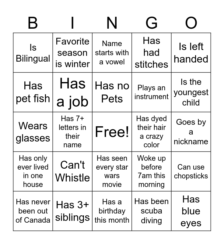 This bingo card has a free space and 24 words: Can't Whistle, Has 3+ siblings, Has no Pets, Has never been out of Canada, Is left handed, Is Bilingual, Has pet fish, Favorite season is winter, Has dyed their hair a crazy color, Has seen every star wars movie, Plays an instrument, Wears glasses, Woke up before 7am this morning, Can use chopsticks, Has a job, Has been scuba diving, Goes by a nickname, Name starts with a vowel, Is the youngest child, Has 7+ letters in their name, Has blue eyes, Has only ever lived in one house, Has had stitches and Has a birthday this month.
