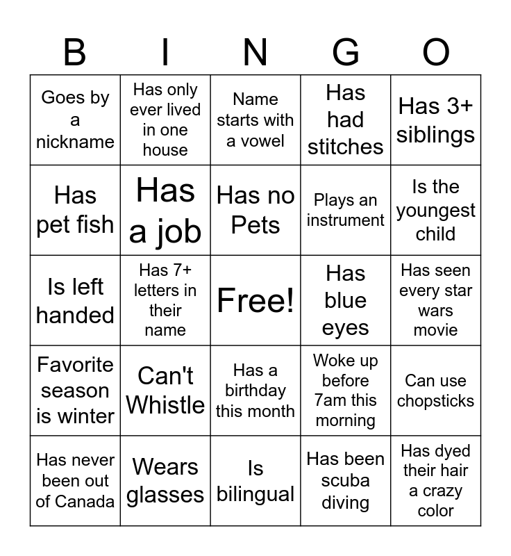 This bingo card has a free space and 24 words: Can't Whistle, Wears glasses, Has no Pets, Has never been out of Canada, Has 3+ siblings, Goes by a nickname, Has pet fish, Has only ever lived in one house, Has blue eyes, Has a birthday this month, Plays an instrument, Is left handed, Woke up before 7am this morning, Can use chopsticks, Has a job, Has been scuba diving, Has seen every star wars movie, Name starts with a vowel, Is the youngest child, Has 7+ letters in their name, Has dyed their hair a crazy color, Favorite season is winter, Has had stitches and Is bilingual.