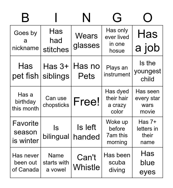 This bingo card has a free space and 24 words: Is bilingual, Name starts with a vowel, Has no Pets, Has never been out of Canada, Has a job, Goes by a nickname, Has pet fish, Has had stitches, Has dyed their hair a crazy color, Is left handed, Plays an instrument, Has a birthday this month, Woke up before 7am this morning, Has 7+ letters in their name, Has 3+ siblings, Has been scuba diving, Has seen every star wars movie, Wears glasses, Is the youngest child, Can use chopsticks, Has blue eyes, Favorite season is winter, Has only ever lived in one hosue and Can't Whistle.