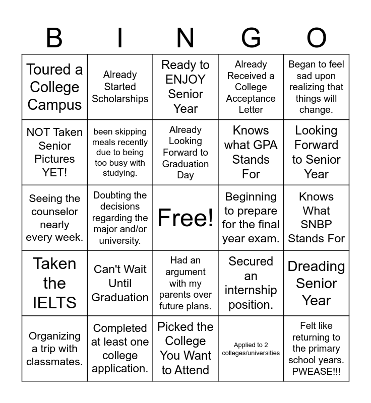 This bingo card has a free space and 24 words: Organizing a trip with classmates., Can't Wait Until Graduation, Already Looking Forward to Graduation Day, Applied to 2 colleges/universities, Began to feel sad upon realizing that things will change., Toured a College Campus, Already Started Scholarships, Ready to ENJOY Senior Year, Beginning to prepare for the final year exam., Knows What SNBP Stands For, Seeing the counselor nearly every week., been skipping meals recently due to being too busy with studying., Secured an internship position., Dreading Senior Year, NOT Taken Senior Pictures YET!, Completed at least one college application., Picked the College You Want to Attend, Already Received a College Acceptance Letter, Looking Forward to Senior Year, Taken the IELTS, Doubting the decisions regarding the major and/or university., Had an argument with my parents over future plans., Knows what GPA Stands For and Felt like returning to the primary school years. PWEASE!!!.