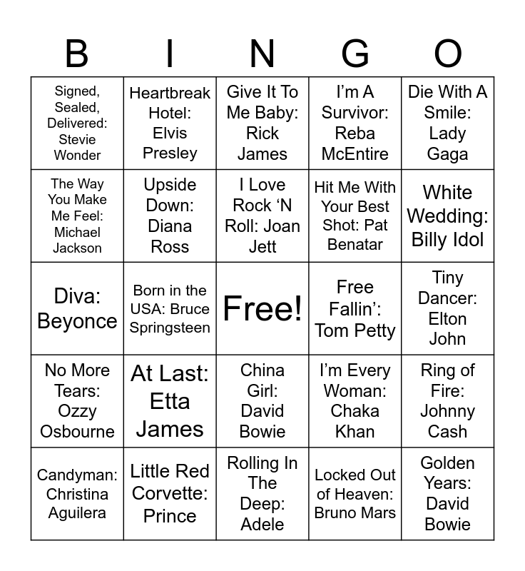 This bingo card has a free space and 50 words: Let’s Stay Together: Al Green, Golden Years: David Bowie, Girls Just Want To Have Fun: Cyndi Lauper, Rolling In The Deep: Adele, At Last: Etta James, Jailhouse Rock: Elvis Presley, Heartbreak Hotel: Elvis Presley, Long Tall Sally: Little Richard, The Way You Make Me Feel: Michael Jackson, I’m Coming Out: Diana Ross, Upside Down: Diana Ross, I’m A Survivor: Reba McEntire, Ring of Fire: Johnny Cash, I’m Every Woman: Chaka Khan, Superstition: Stevie Wonder, Dancing In the Dark: Bruce Springsteen, I Love Rock ‘N Roll: Joan Jett, Free Fallin’: Tom Petty, You Give Love A Bad Name: Bon Jovi, Die With A Smile: Lady Gaga, Born in the USA: Bruce Springsteen, Locked Out of Heaven: Bruno Mars, Signed, Sealed, Delivered: Stevie Wonder, Hit Me With Your Best Shot: Pat Benatar, Fly Away: Lenny Kravitz, Bad Reputation: Joan Jett, White Wedding: Billy Idol, Super Freak: Rick James, Give It To Me Baby: Rick James, China Girl: David Bowie, Movin’ Out: Billy Joel, All Night Long: Lionel Richie, The Tide Is High: Blondie, Careless Whisper: George Michael, Little Red Corvette: Prince, Kiss: Prince, Heart of Glass: Blondie, Papa’s Got A Brand New Bag: James Brown, I Got You: James Brown, Tiny Dancer: Elton John, Ain’t No Mountain High Enough: Marvin Gaye, Respect: Aretha Franklin, Never Too Much: Luther Vandross, Don’t Stop Til You Get Enough: Michael Jackson, Candyman: Christina Aguilera, Diva: Beyonce, 9 to 5: Dolly Parton, Crazy Train: Ozzy Osbourne, No More Tears: Ozzy Osbourne and Jamming: Bob Marley.
