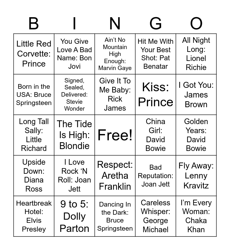 This bingo card has a free space and 50 words: Ring of Fire: Johnny Cash, I’m Every Woman: Chaka Khan, Superstition: Stevie Wonder, Dancing In the Dark: Bruce Springsteen, I Love Rock ‘N Roll: Joan Jett, Free Fallin’: Tom Petty, You Give Love A Bad Name: Bon Jovi, Die With A Smile: Lady Gaga, Born in the USA: Bruce Springsteen, Locked Out of Heaven: Bruno Mars, Signed, Sealed, Delivered: Stevie Wonder, Hit Me With Your Best Shot: Pat Benatar, Fly Away: Lenny Kravitz, Bad Reputation: Joan Jett, White Wedding: Billy Idol, Super Freak: Rick James, Give It To Me Baby: Rick James, China Girl: David Bowie, Movin’ Out: Billy Joel, All Night Long: Lionel Richie, The Tide Is High: Blondie, Careless Whisper: George Michael, Little Red Corvette: Prince, Kiss: Prince, Heart of Glass: Blondie, Papa’s Got A Brand New Bag: James Brown, I Got You: James Brown, Tiny Dancer: Elton John, Ain’t No Mountain High Enough: Marvin Gaye, Respect: Aretha Franklin, Never Too Much: Luther Vandross, Don’t Stop Til You Get Enough: Michael Jackson, Candyman: Christina Aguilera, Diva: Beyonce, 9 to 5: Dolly Parton, Crazy Train: Ozzy Osbourne, No More Tears: Ozzy Osbourne, Jamming: Bob Marley, Let’s Stay Together: Al Green, Golden Years: David Bowie, Girls Just Want To Have Fun: Cyndi Lauper, Rolling In The Deep: Adele, At Last: Etta James, Jailhouse Rock: Elvis Presley, Heartbreak Hotel: Elvis Presley, Long Tall Sally: Little Richard, The Way You Make Me Feel: Michael Jackson, I’m Coming Out: Diana Ross, Upside Down: Diana Ross and I’m A Survivor: Reba McEntire.