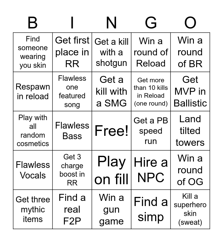This bingo card has a free space and 32 words: Find a simp, Flawless Drums, Flawless Bass, Flawless Lead, Flawless Vocals, Flawless one featured song, Win a round of BR, Win a round of OG, Get first place in RR, Get first in battle stage, Get a kill with a SMG, Get a kill with a shotgun, Get a kill with a pistol, Get a kill with a sword, Get a PB speed run, Pick up a crown, Get three mythic items, Play with all random cosmetics, Play on fill, Get 3 charge boost in RR, Hire a NPC, Kill a boss, Land tilted towers, Find a real F2P, Kill a superhero skin (sweat), Win a round of Reload, Get more than 10 kills in Reload (one round), Respawn in reload, Find someone wearing you skin, Win a gun game, Win a game of ballistic and Get MVP in Ballistic.