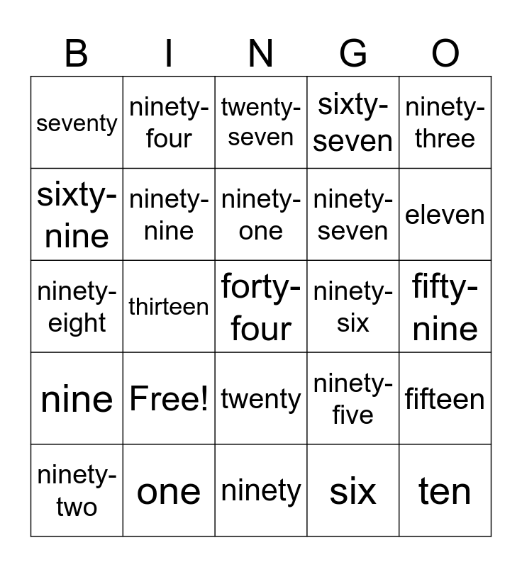 This bingo card has 25 words: Free!, ninety, ninety-one, ninety-two, ninety-three, seventy, sixty-nine, ninety-four, ninety-six, twenty, ninety-seven, ninety-eight, ninety-five, fifteen, ninety-nine, ten, fifty-nine, twenty-seven, eleven, thirteen, forty-four, one, nine, sixty- seven and six.