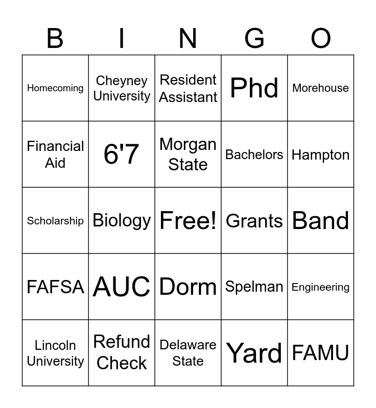 This bingo card has a free space and 34 words: Major, Yard, Minor, Bursar, FAFSA, 6'7, Morehouse, Lincoln University, Cheyney University, HBCU, Morgan State, Resident Assistant, Loan, Howard, Grants, Hampton, Refund Check, Scholarship, AUC, Spelman, Dorm, Bison, Homecoming, Band, Delaware State, FAMU, Phd, Masters, Bachelors, Financial Aid, NCAA, Biology, Engineering and Psychology.