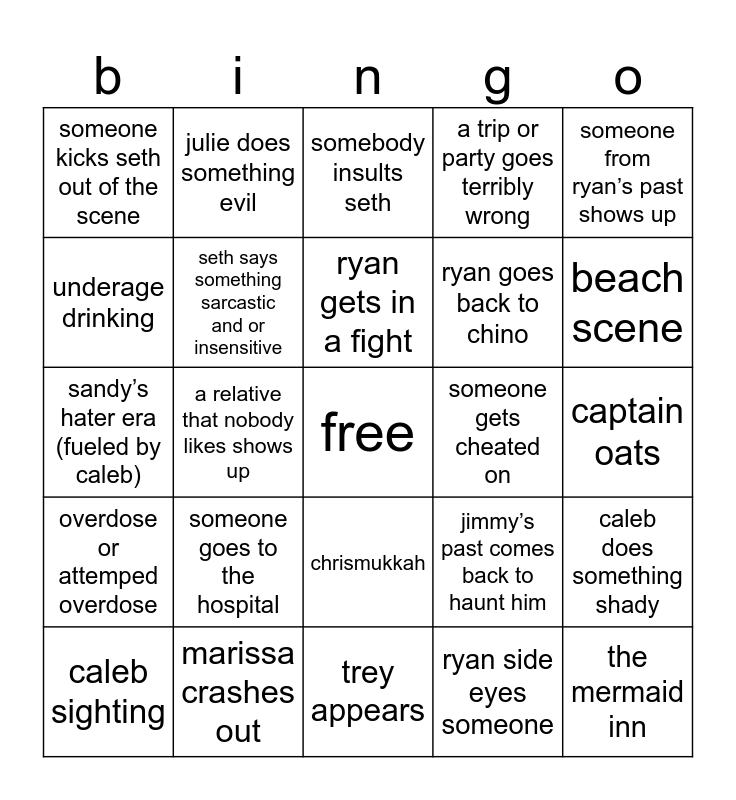 This bingo card has a free space and 24 words: someone goes to the hospital, marissa crashes out, ryan gets in a fight, caleb sighting, someone from ryan’s past shows up, someone kicks seth out of the scene, underage drinking, julie does something evil, someone gets cheated on, chrismukkah, ryan goes back to chino, sandy’s hater era (fueled by caleb), jimmy’s past comes back to haunt him, caleb does something shady, seth says something sarcastic and or insensitive, ryan side eyes someone, captain oats, somebody insults seth, beach scene, a relative that nobody likes shows up, the mermaid inn, overdose or attemped overdose, a trip or party goes terribly wrong and trey appears.