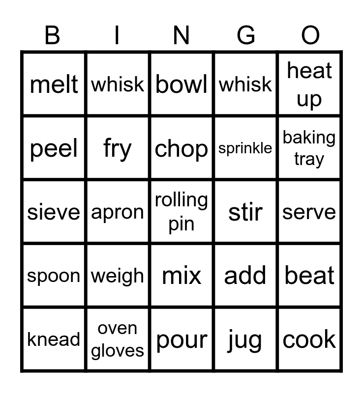 This bingo card has 25 words: weigh, pour, chop, knead, heat up, melt, peel, whisk, stir, mix, sprinkle, sieve, add, beat, fry, cook, serve, bowl, baking tray, apron, rolling pin, oven gloves, spoon, whisk and jug.