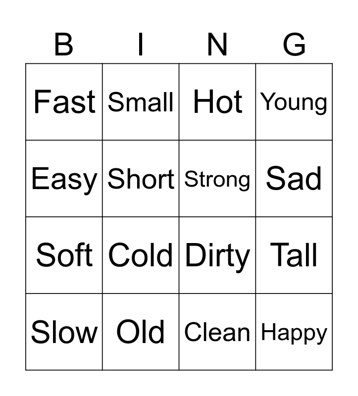 This bingo card has 16 words: Old, Tall, Hot, Fast, Soft, Small, Dirty, Clean, Easy, Short, Slow, Young, Cold, Sad, Strong and Happy.