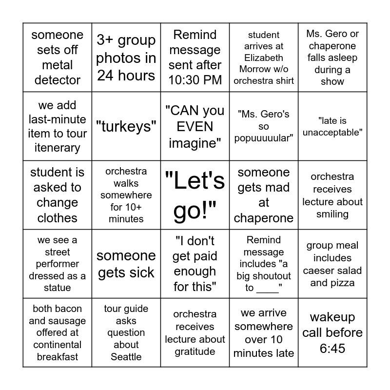 This bingo card has a free space and 39 words: rat sighting, someone argues with New Yorker, "I don't want to see any ____", "turkeys", both bacon and sausage offered at continental breakfast, "I don't get paid enough for this", "CAN you EVEN imagine", "Curly and Moe", Ms. Gero or chaperone falls asleep during a show, we see a street performer dressed as a statue, orchestra walks somewhere for 10+ minutes, student arrives at Elizabeth Morrow w/o orchestra shirt, wakeup call before 6:45, orchestra receives lecture about smiling, someone gets mad at chaperone, someone gets sick, sophomore boy temporarily goes missing, someone sets off metal detector, students eat food out of stand/truck, Remind message includes "a big shoutout to ____", we add last-minute item to tour itenerary, orchestra receives lecture about gratitude, "Ms. Gero's so popuuuuular", "late is unacceptable", orchestra receives lecture about formality, orchestra receives lecture about cleanliness, 5 Remind messages sent in 5 minutes, someone interrupts tour guide to tell arbitrary story, clinician suggests different tempo, 3+ group photos in 24 hours, "I don't want to hear it", phone is confiscated, Remind message sent after 10:30 PM, tour guide asks question about Seattle, we arrive somewhere over 10 minutes late, instrument, reed or string breaks, group meal includes caeser salad and pizza, student is asked to change clothes and student removes shoes on bus.