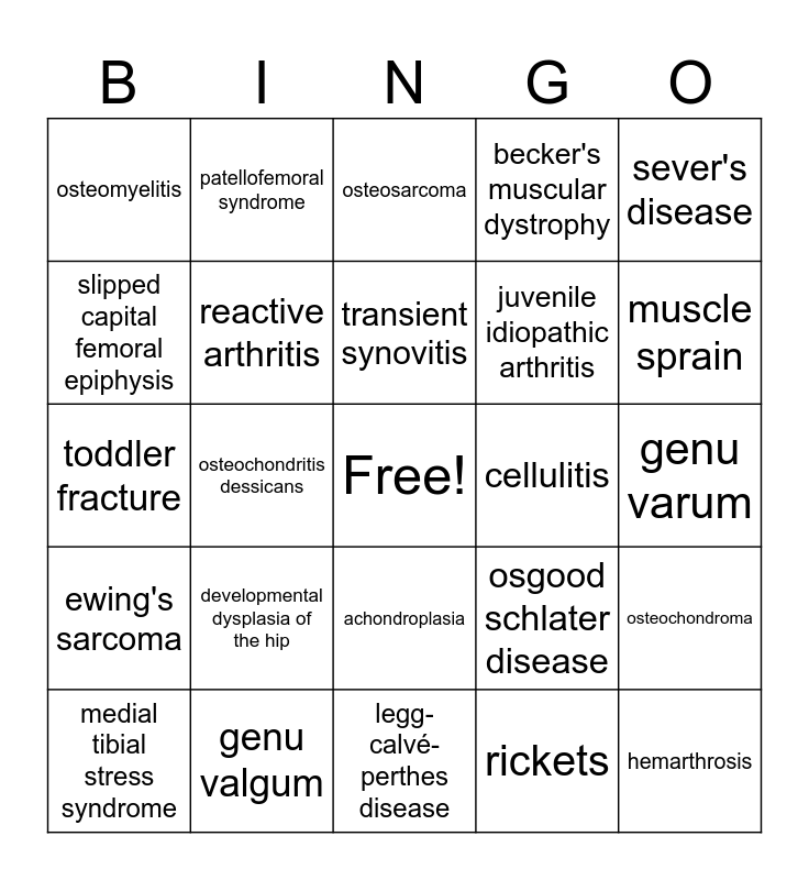 This bingo card has a free space and 24 words: developmental dysplasia of the hip, genu valgum, transient synovitis, medial tibial stress syndrome, sever's disease, osteomyelitis, slipped capital femoral epiphysis, patellofemoral syndrome, cellulitis, achondroplasia, juvenile idiopathic arthritis, toddler fracture, osgood schlater disease, osteochondroma, reactive arthritis, rickets, genu varum, osteosarcoma, muscle sprain, osteochondritis dessicans, hemarthrosis, ewing's sarcoma, becker's muscular dystrophy and legg-calvé-perthes disease.