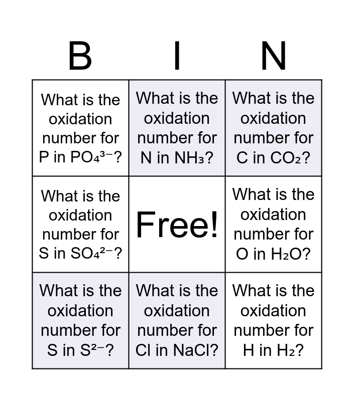 This bingo card has a free space and 8 words: What is the oxidation number for S in SO₄²⁻?, What is the oxidation number for N in NH₃?, What is the oxidation number for O in H₂O?, What is the oxidation number for S in S²⁻?, What is the oxidation number for C in CO₂?, What is the oxidation number for P in PO₄³⁻?, What is the oxidation number for Cl in NaCl? and What is the oxidation number for H in H₂?.