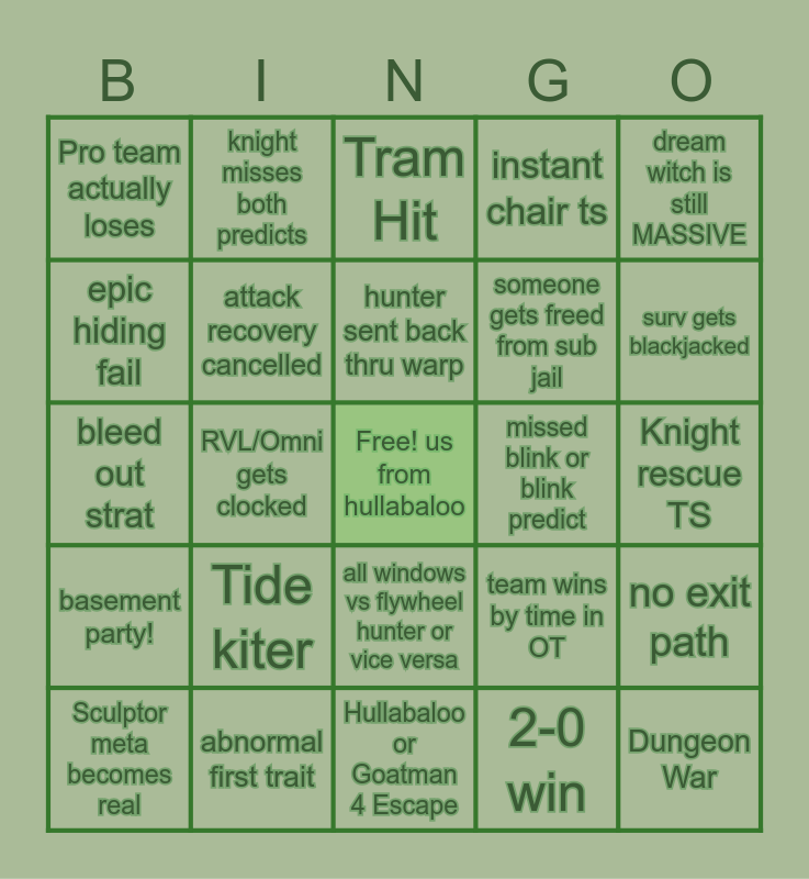 This bingo card has a free space and 29 words: Sculptor meta becomes real, Live meltdown reaction, RVL/Omni gets clocked, Double Decoder, Pro team actually loses, Tram Hit, attack recovery cancelled, Tide kiter, missed blink or blink predict, abnormal first trait, Knight rescue TS, Dungeon War, Hullabaloo or Goatman 4 Escape, 2-0 win, surv gets blackjacked, wall stun, all windows vs flywheel hunter or vice versa, basement party!, dream witch is still MASSIVE, bleed out strat, team wins by time in OT, no detention on a weird hunter, someone gets freed from sub jail, epic hiding fail, instant chair ts, knight misses both predicts, no exit path, hunter sent back thru warp and double rescuer.