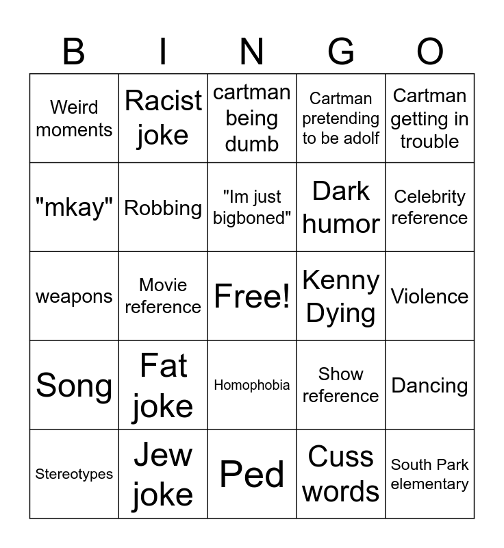 This bingo card has a free space and 24 words: Fat joke, Jew joke, "Im just bigboned", Stereotypes, Cartman getting in trouble, Weird moments, "mkay", Racist joke, Kenny Dying, Homophobia, Dark humor, weapons, Show reference, Dancing, Robbing, Cuss words, Violence, cartman being dumb, Celebrity reference, Movie reference, South Park elementary, Song, Cartman pretending to be adolf and Ped.
