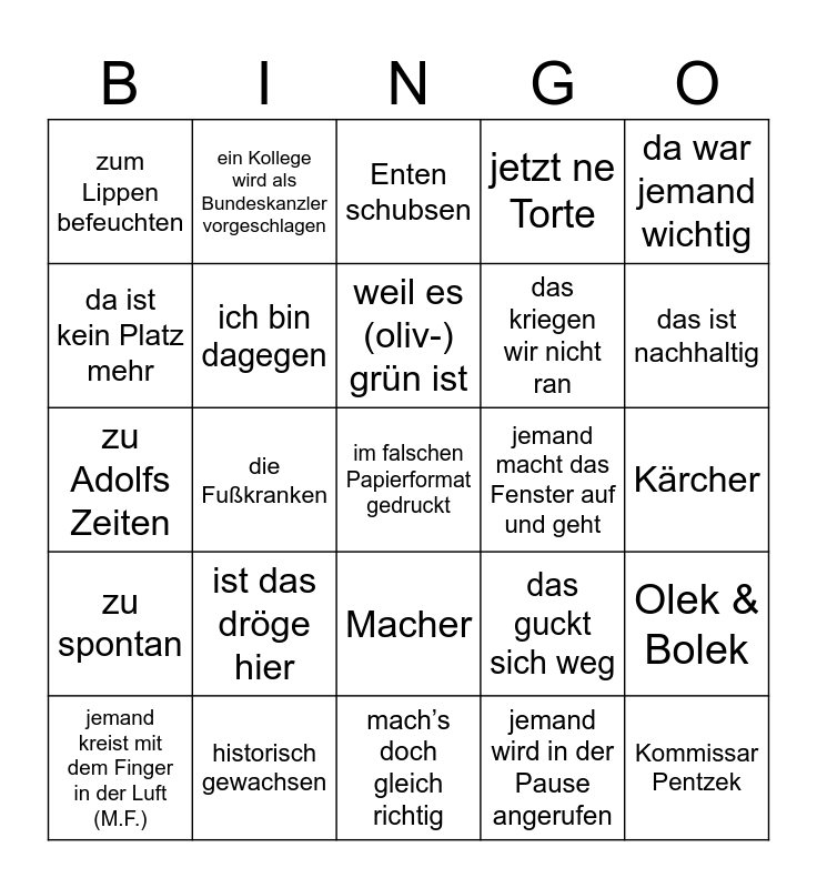 This bingo card has 52 words: der Einkauf ist schuld, im falschen Papierformat gedruckt, hast du mal wieder gepfuscht?, mach’s doch gleich richtig, ist das dröge hier, jemand wird vom Chef versetzt, ein Kollege wird als Bundeskanzler vorgeschlagen, Selbstläufer, da ist kein Platz mehr, von Eurest verwöhnt, ich bin dagegen, für militärische Anwendung, Olek & Bolek, das guckt sich weg, als Stubenältester, jemand hat nicht die Tageszeit gesagt, weil es (oliv-) grün ist, jemand macht das Fenster auf und geht, die Kuh vom Eis holen, da war jemand wichtig, die Fußkranken, jemand wird in der Pause angerufen, zum Lippen befeuchten, das kriegen wir nicht ran, Eumel, Kommissar Pentzek, Eintracht-Frankfurt-Hymne, das wird injearbeitet, das ist nachhaltig, Käsebrot, Gehacktes-Runde, jetzt ne Torte, wir hatten ja nichts, BWL-Justus, Superkonzentrations- modus, Enten schubsen, historisch gewachsen, das ist aber frisch hier, das wird super, Schulterklopfer, Chef kommt ins Büro (stille), Kärcher, zu spontan, Kafe, Macher, der/die ist halt besonders, denken ist schonmal ganz schlecht, zu Adolfs Zeiten, es könnte so schön sein, Knödelmodell, jemand kreist mit dem Finger in der Luft (M.F.) and Teufelszeug.