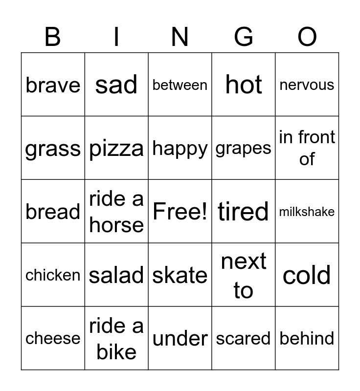 This bingo card has a free space and 29 words: cheese, angry, ride a horse, cold, brave, between, pizza, salad, tired, ride a bike, milkshake, behind, under, scared, in front of, sandwich, skate, chicken, nervous, bread, next to, fries, grapes, grass, hot, sad, cold, happy and thirsty.
