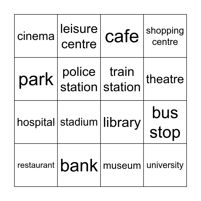 This bingo card has 16 words: bank, bus stop, cafe, cinema, hospital, leisure centre, library, museum, park, police station, restaurant, shopping centre, stadium, theatre, train station and university.