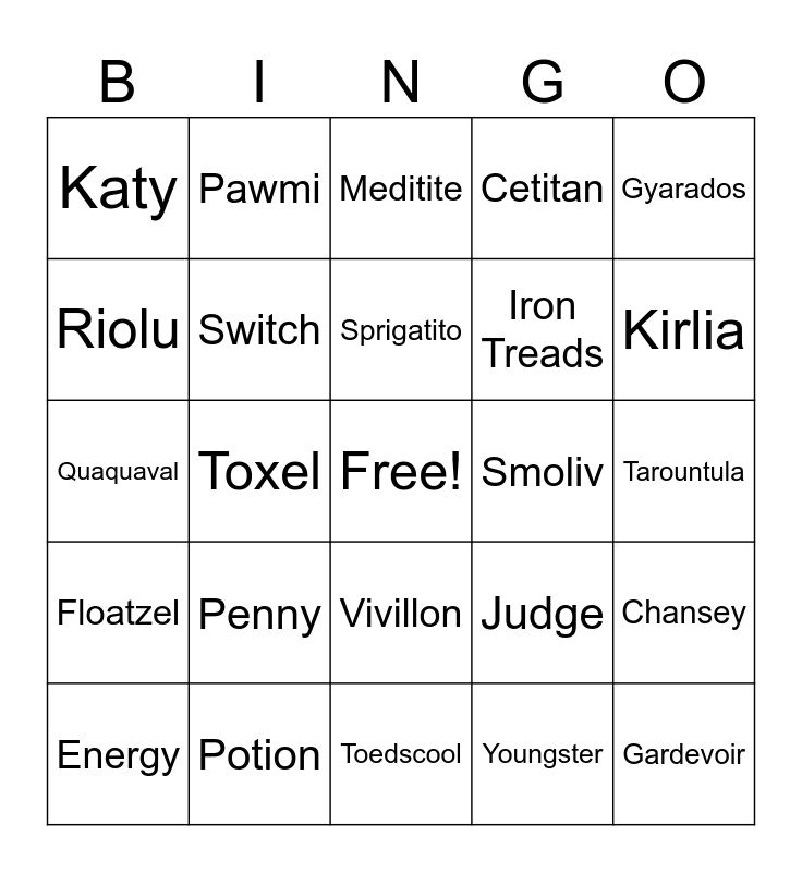 This bingo card has a free space and 165 words: Arven, Banette, Beach Court, Bisharp, Blissey, Bombirdier, Breloom, Bruxish, Buizel, Cacnea, Cacturne, Capsakid, Cetitan, Cetoddle, Chansey, Charcadet, Clauncher, Clawitzer, Croagunk, Crocalor, Crushing Hammer, Cyclizar, Dachsbun, Dedenne, Defense Band, Dolliv, Dondozo, Drifblim, Drifloon, Drowzee, Electric Generator, Energy Retrieval, Energy Search, Energy Switch, Energy, Espathra, Exp. Share, Fidough, Flaaffy, Flabébé, Flamigo, Flittle, Floatzel, Floette, Floragato, Florges, Forretress, Fuecoco, Gardevoir, Gogoat, Great Tusk, Greavard, Greedent, Grimer, Growlithe, Gyarados, Hawlucha, Heracross, Houndoom, Houndour, Houndstone, Hypno, Indeedee, Iron Treads, Jacq, Judge, Katy, Kilowattrel, Kingambit, Kirlia, Klawf, Klefki, Koraidon, Krokorok, Krookodile, Lechonk, Lucario, Mabosstiff, Magikarp, Magnemite, Magneton, Magnezone, Mankey, Mareep, Maschiff, Maushold, Medicham, Meditite, Meowscarada, Mesagoza, Miraidon, Miriam, Muk, Nemona, Nest Ball, Oinkologne, Pachirisu, Pal Pad, Pawmi, Pawmo, Pawmot, Pawniard, Penny, Picnic Basket, Pineco, Poké Ball, PokéGear 3.0, Pokémon Catcher, Potion, Primeape, Professor's Research, Quaquaval, Quaxly, Quaxwell, Ralts, Rare Candy, Revavroom, Riolu, Rock Chestplate, Rocky Helmet, Rotom, Sandaconda, Sandile, Scatterbug, Scovillain, Seviper, Shroomish, Shuppet, Silicobra, Skeledirge, Skiddo, Skwovet, Slowbro, Slowpoke, Smoliv, Spewpa, Spidops, Spiritomb, Sprigatito, Squawkabilly, Staraptor, Staravia, Starly, Stonjourner, Switch, Tandemaus, Tarountula, Tatsugiri, Team Star Grunt, Toedscool, Toedscruel, Torkoal, Toxel, Toxicroak, Toxtricity, Tropius, Ultra Ball, Varoom, Vitality Band, Vivillon, Wattrel, Wiglett, Wugtrio, Youngster and Zangoose.