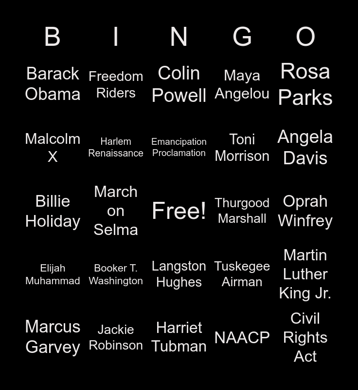 This bingo card has a free space and 24 words: Booker T. Washington, Jackie Robinson, Emancipation Proclamation, Marcus Garvey, Rosa Parks, Barack Obama, Malcolm X, Freedom Riders, Thurgood Marshall, Langston Hughes, Toni Morrison, Billie Holiday, Tuskegee Airman, Martin Luther King Jr., Harlem Renaissance, NAACP, Oprah Winfrey, Colin Powell, Angela Davis, March on Selma, Civil Rights Act, Elijah Muhammad, Maya Angelou and Harriet Tubman.