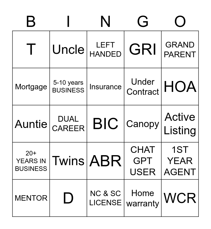 This bingo card has 35 words: A, BIC ELIGIBLE, Married With Children, 5-10 years BUSINESS, ABR, GRI, Mortgage, B, Insurance, PSA, Auntie, GRAND PARENT, Sponsor, 2-5 YEARS AGENT, T, Canopy, Home warranty, DUAL CAREER, 20+ YEARS IN BUSINESS, BIC, CHAT GPT USER, MENTOR, 1ST YEAR AGENT, D, LEFT HANDED, HOA, WCR, YPN, Under Contract, Active Listing, MD LICENSE, NC & SC LICENSE, Twins, Uncle and Team.