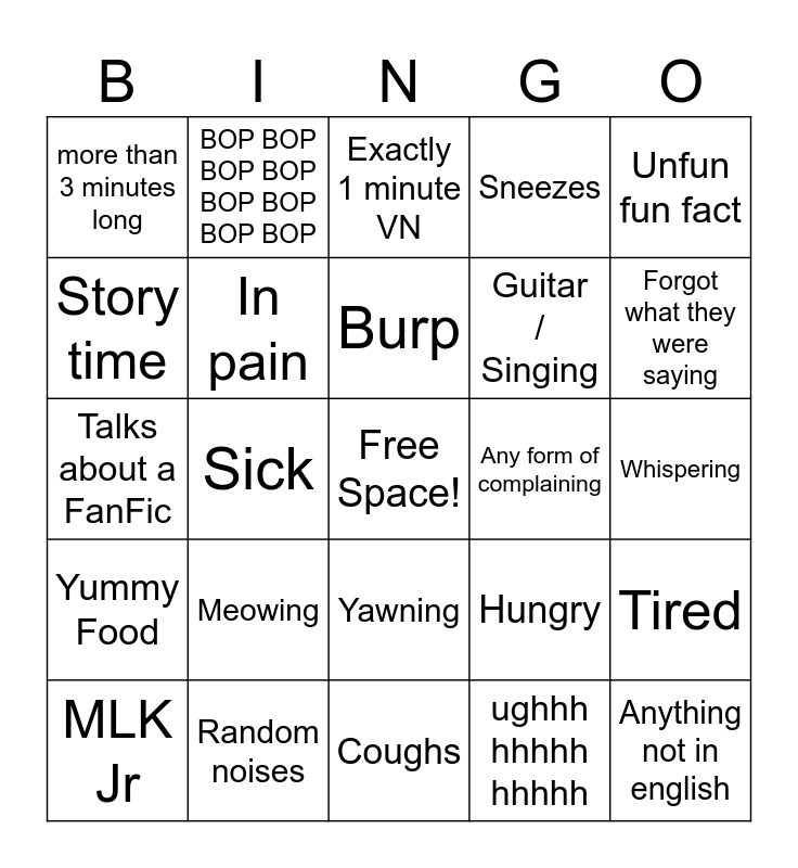 This bingo card has a free space and 24 words: Meowing, Random noises, Burp, MLK Jr, Unfun fun fact, more than 3 minutes long, Story time, BOP BOP BOP BOP BOP BOP BOP BOP, Any form of complaining, Yawning, Guitar / Singing, Talks about a FanFic, Hungry, Tired, In pain, ughhh hhhhh hhhhh, Whispering, Exactly 1 minute VN, Forgot what they were saying, Sick, Anything not in english, Yummy Food, Sneezes and Coughs.