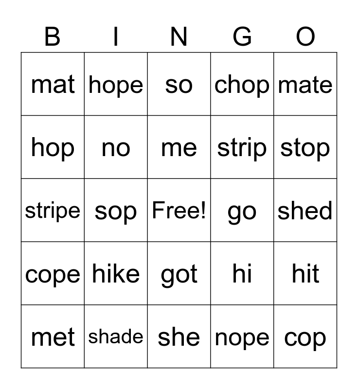 This bingo card has a free space and 24 words: hike, shade, me, met, mate, mat, hop, hope, go, got, strip, stripe, hi, hit, no, nope, shed, so, stop, sop, cop, cope, chop and she.