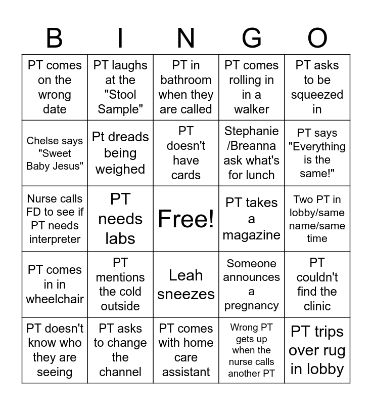This bingo card has a free space and 24 words: PT mentions the cold outside, PT asks to change the channel, PT doesn't have cards, PT doesn't know who they are seeing, PT asks to be squeezed in, PT comes on the wrong date, Chelse says "Sweet Baby Jesus", PT laughs at the "Stool Sample", PT takes a magazine, Leah sneezes, Stephanie /Breanna ask what's for lunch, Nurse calls FD to see if PT needs interpreter, Someone announces a pregnancy, PT couldn't find the clinic, Pt dreads being weighed, Wrong PT gets up when the nurse calls another PT, Two PT in lobby/same name/same time, PT in bathroom when they are called, PT says "Everything is the same!", PT needs labs, PT trips over rug in lobby, PT comes in in wheelchair, PT comes rolling in in a walker and PT comes with home care assistant.