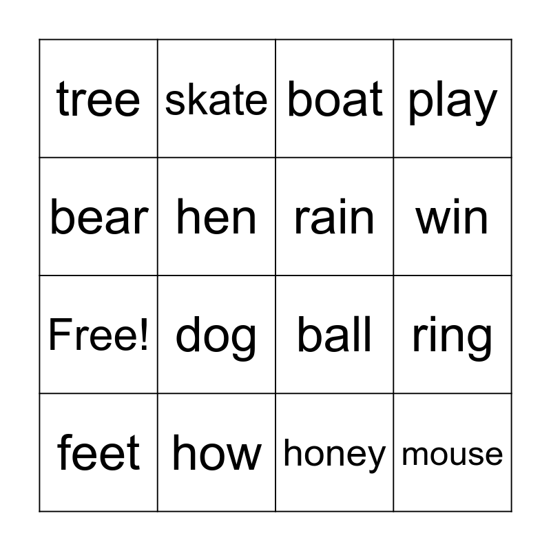 This bingo card has 20 words: ring, cat, boat, snake, feet, bear, how, tree, Free!, skate, dog, ball, hen, mouse, rain, car, win, play, honey and school.