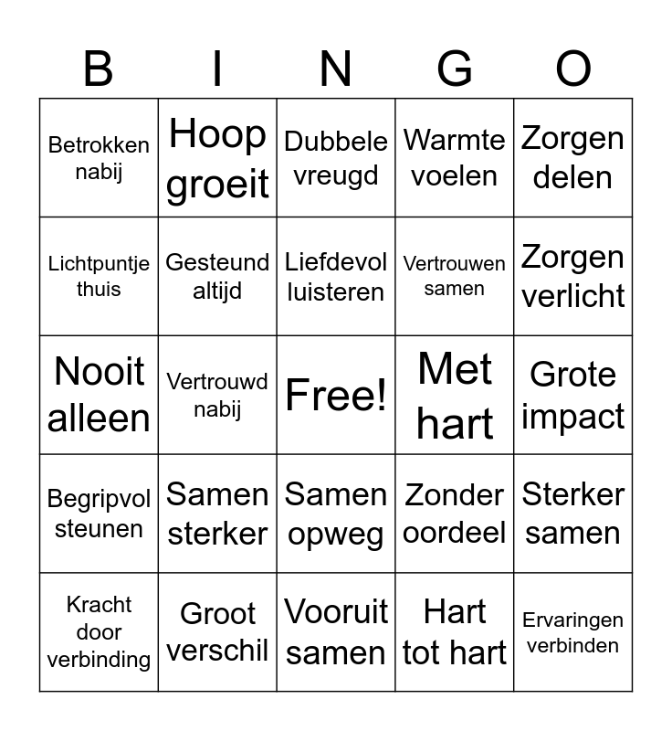This bingo card has a free space and 24 words: Samen sterker, Groot verschil, Liefdevol luisteren, Kracht door verbinding, Zorgen delen, Betrokken nabij, Lichtpuntje thuis, Hoop groeit, Met hart, Samen opweg, Vertrouwen samen, Nooit alleen, Zonder oordeel, Sterker samen, Gesteund altijd, Hart tot hart, Grote impact, Dubbele vreugd, Zorgen verlicht, Vertrouwd nabij, Ervaringen verbinden, Begripvol steunen, Warmte voelen and Vooruit samen.