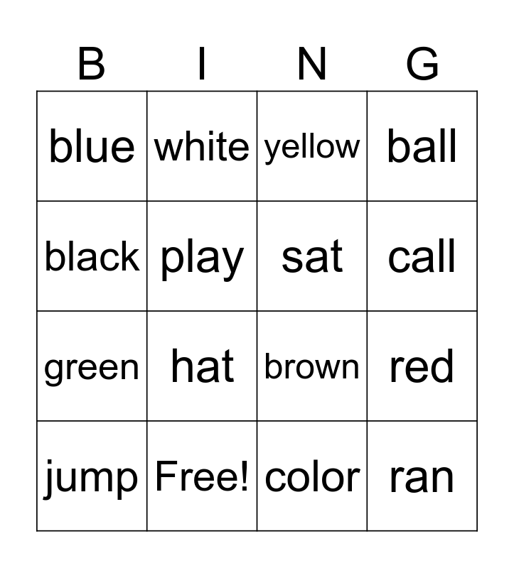 This bingo card has 16 words: Free!, red, yellow, blue, green, white, brown, color, black, play, jump, ball, hat, call, sat and ran.