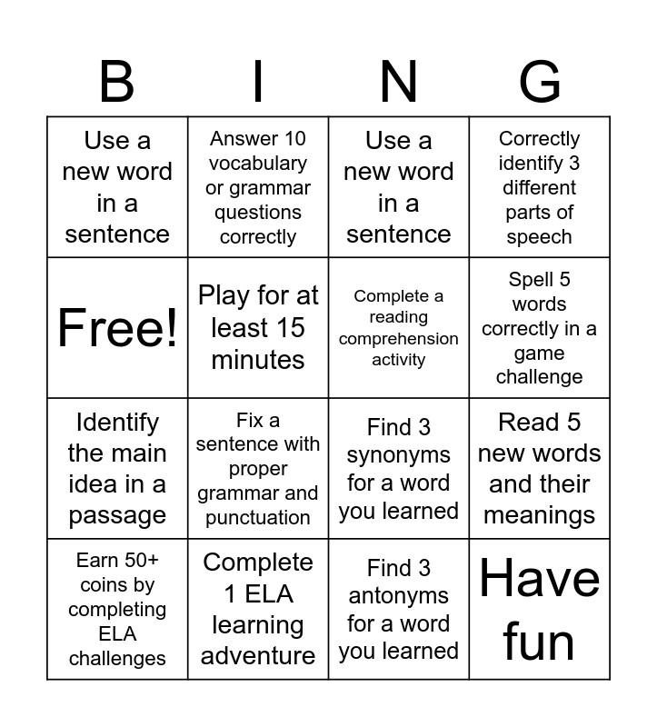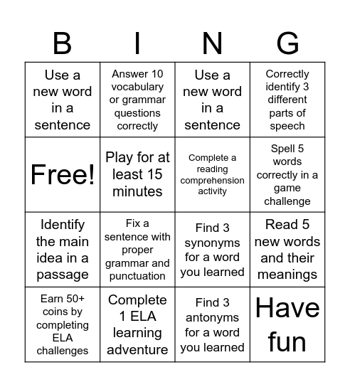 This bingo card has 16 words: Complete 1 ELA learning adventure, Read 5 new words and their meanings, Use a new word in a sentence, Use a new word in a sentence, Identify the main idea in a passage, Answer 10 vocabulary or grammar questions correctly, Find 3 synonyms for a word you learned, Find 3 antonyms for a word you learned, Free!, Play for at least 15 minutes, Earn 50+ coins by completing ELA challenges, Correctly identify 3 different parts of speech, Fix a sentence with proper grammar and punctuation, Spell 5 words correctly in a game challenge, Complete a reading comprehension activity and Have fun.