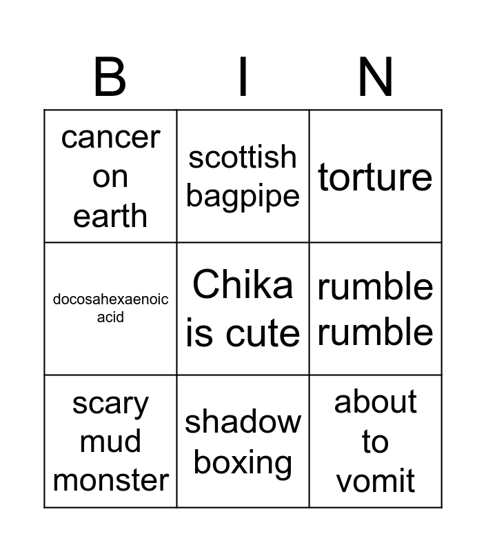 This bingo card has a free space and 8 words: rumble rumble, torture, scottish bagpipe, scary mud monster, cancer on earth, about to vomit, docosahexaenoic acid and shadow boxing.