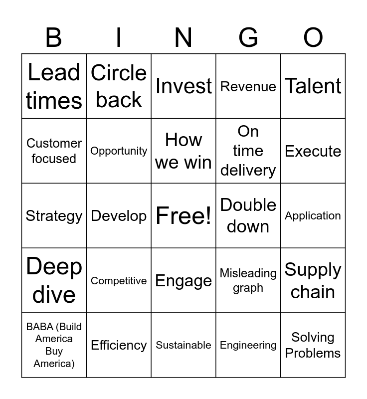 This bingo card has a free space and 40 words: Artificial Intelligence (A.I.), Strategy, Leverage, Opportunity, Efficiency, Engage, How we win, Growth, Talent, Deep dive, Develop, Revenue, Solving Problems, Application, Double down, Competitive, Global operations, Lead times, Differentiate, Invest, Supply chain, Engineering, On time delivery, Customer focused, Delve, Bonuses, Synergy, Leadership, Employer of Choice, Tremendous, Tariffs, BABA (Build America Buy America), Deloite, Misleading graph, Execute, Sustainable, "Can somebody mute?", Optimization, Circle back and Committed.