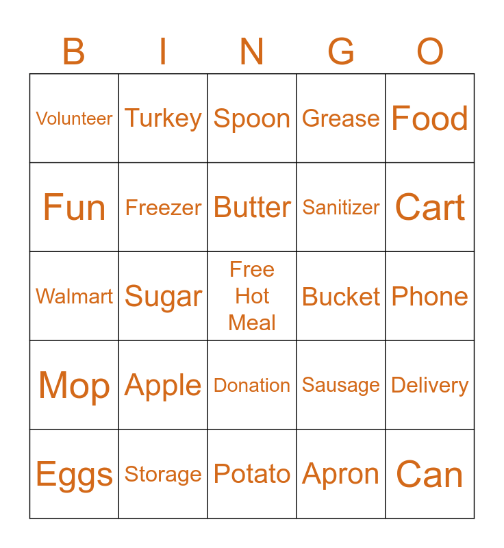 This bingo card has a free space and 34 words: Laundry, Apron, Bake, Bread, Mop, Freezer, Food, Eggs, Turkey, Van, Butter, Spoon, Cheese, Blessing, Bucket, Cart, Storage, Walmart, Apple, Sausage, Donation, Fellowship, Volunteer, Phone, Potato, Can, Grease, Noodle, Sanitizer, Fun, Serve, Sugar, Delivery and Whistle.