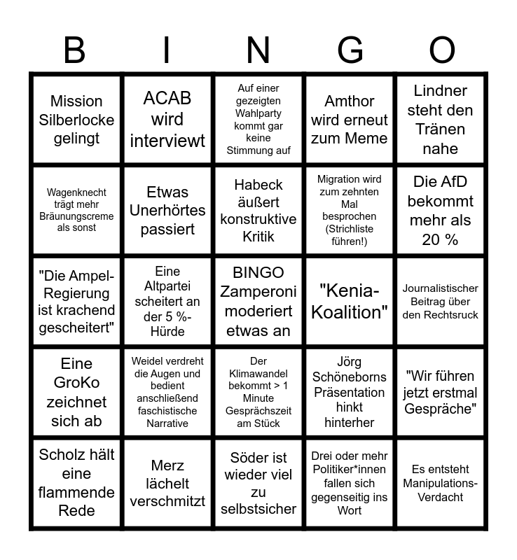 This bingo card has a free space and 24 words: Weidel verdreht die Augen und bedient anschließend faschistische Narrative, Merz lächelt verschmitzt, Habeck äußert konstruktive Kritik, Scholz hält eine flammende Rede, Lindner steht den Tränen nahe, Mission Silberlocke gelingt, Wagenknecht trägt mehr Bräunungscreme als sonst, ACAB wird interviewt, "Kenia-Koalition", Der Klimawandel bekommt > 1 Minute Gesprächszeit am Stück, Migration wird zum zehnten Mal besprochen (Strichliste führen!), "Die Ampel-Regierung ist krachend gescheitert", Jörg Schöneborns Präsentation hinkt hinterher, "Wir führen jetzt erstmal Gespräche", Etwas Unerhörtes passiert, Drei oder mehr Politiker*innen fallen sich gegenseitig ins Wort, Journalistischer Beitrag über den Rechtsruck, Auf einer gezeigten Wahlparty kommt gar keine Stimmung auf, Die AfD bekommt mehr als 20 %, Eine Altpartei scheitert an der 5 %-Hürde, Es entsteht Manipulations-Verdacht, Eine GroKo zeichnet sich ab, Amthor wird erneut zum Meme and Söder ist wieder viel zu selbstsicher.