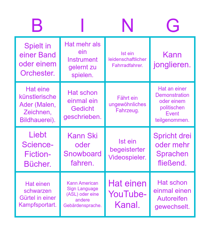 This bingo card has 72 words: Free!, Hat mehr als ein Instrument gelernt zu spielen., Spricht drei oder mehr Sprachen fließend., Ist schon einmal Marathon gelaufen., Ist Vegetarier oder Veganer., Hat ein Haustier., Kann jonglieren., Ist schon einmal Fallschirmspringen gegangen., Liebt Science-Fiction-Bücher., Macht Yoga., War schon in mehr als 10 Ländern., Hat eine eigene Website oder einen Blog., Kann Ski oder Snowboard fahren., Spielt in einer Band oder einem Orchester., Liebt es zu kochen oder zu backen., Ist ein begeisterter Videospieler., Sammelt etwas Ungewöhnliches., Hat eine künstlerische Ader (Malen, Zeichnen, Bildhauerei)., Hat schon einmal bei einer Theateraufführung mitgemacht., Hat einen YouTube-Kanal., Ist ein Morgenmensch., Hat einen schwarzen Gürtel in einer Kampfsportart., Ist in seiner Stadt oder seinem Ort geboren., Hat schon einmal einen Preis oder eine Auszeichnung gewonnen., Liebt es, Kreuzworträtsel oder Sudoku zu lösen., Ist ein großer Fan einer bestimmten Sportmannschaft., Hat ein ungewöhnliches Haustier., Ist schon einmal mit einem Heißluftballon geflogen., Spielt Schach., Hat eine Sammlung von alten Vinylplatten., Ist ein Hobbygärtner., Kann ohne Rezept backen oder kochen., Hat schon einmal bei einer Talentshow mitgemacht., Liebt es, Karaoke zu singen., Hat eine Leidenschaft für Astronomie., Kann eine oder mehrere historische Reden auswendig., Hat schon einmal einen Baum gepflanzt., Ist nachts besonders kreativ., Hat schon einmal ein Gedicht geschrieben., Liest jeden Tag Zeitung oder Nachrichten online., Hat einen ehrenamtlichen Dienst geleistet., Ist ein großer Fan von Brettspielen., Kann Zauberkunststücke vorführen., Hat schon einmal einen Berg bestiegen., Ist ein Fan von Anime oder Manga., Hat schon einmal einen Autoreifen gewechselt., Kann eine Fremdsprache fließend lesen, aber nicht sprechen., Hat schon einmal eine Diät gemacht., Hat eine Allergie gegen etwas Ungewöhnliches., Hat schon einmal in einer Band gespielt., Ist ohne GPS in einer fremden Stadt herumgekommen., Hat schon einmal im Ausland gelebt., Hat eine Vorliebe für exotisches Essen., Kann American Sign Language (ASL) oder eine andere Gebärdensprache., Hat einen eigenen Garten., Hat schon einmal einen Tanzwettbewerb gewonnen., Ist ein leidenschaftlicher Fahrradfahrer., Hat an einer Demonstration oder einem politischen Event teilgenommen., Hat eine eigene App entwickelt oder programmiert., Kann ein Musikinstrument selbst bauen oder reparieren., Hat schon einmal bei einem Quizwettbewerb gewonnen., Liebt es, Dokumentarfilme zu schauen., Hat schon einmal einen Preis in einem Kunstwettbewerb gewonnen., Ist ein Experte im Origami-Falten., Hat eine Zwillingsschwester oder einen Zwillingsbruder., Hat eine Leidenschaft für Vintage-Mode., Fährt ein ungewöhnliches Fahrzeug., Hat schon einmal einen aktiven Vulkan besichtigt., Ist ein begeisterter Schwimmer., Hat schon einmal ein Buch geschrieben oder veröffentlicht., Hat eine Sammlung von Münzen oder Briefmarken. and Hat schon einmal einen Podcast aufgenommen oder veröffentlicht..