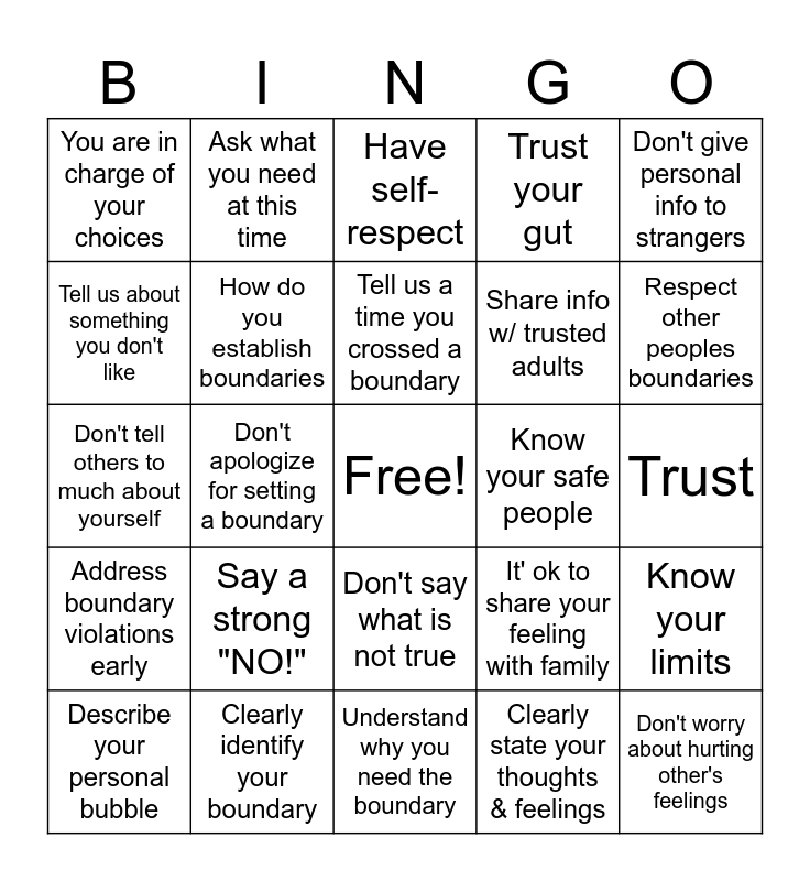 This bingo card has a free space and 24 words: Describe your personal bubble, Say a strong "NO!", Tell us a time you crossed a boundary, Clearly state your thoughts & feelings, Don't give personal info to strangers, You are in charge of your choices, Ask what you need at this time, Have self-respect, Know your safe people, Trust, Don't tell others to much about yourself, How do you establish boundaries, It' ok to share your feeling with family, Know your limits, Tell us about something you don't like, Clearly identify your boundary, Understand why you need the boundary, Trust your gut, Respect other peoples boundaries, Address boundary violations early, Don't apologize for setting a boundary, Don't say what is not true, Share info w/ trusted adults and Don't worry about hurting other's feelings.