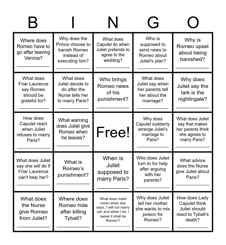 This bingo card has a free space and 24 words: What is Romeo’s punishment? ___________, Where does Romeo hide after killing Tybalt? ___________, Who brings Romeo news of his punishment? ___________, What does the Nurse give Romeo from Juliet? ___________, Why is Romeo upset about being banished? ___________, Where does Romeo have to go after leaving Verona? ____________, What does Friar Laurence say Romeo should be grateful for? ____________, Why does the Prince choose to banish Romeo instead of executing him? _____________, Why does Capulet suddenly arrange Juliet’s marriage to Paris? _____________, When is Juliet supposed to marry Paris? __________, What does Juliet say when her parents tell her about the marriage? ____________, How does Capulet react when Juliet refuses to marry Paris? _____________, Who does Juliet turn to for help after arguing with her parents? _____________, What advice does the Nurse give Juliet about Paris? _____________, What does Juliet decide to do after the Nurse tells her to marry Paris? ____________, Why does Juliet tell her mother she wants to mix poison for Romeo? _____________, What does Juliet say that makes her parents think she agrees to marry Paris? ______________, What does Capulet do when Juliet pretends to agree to the wedding? ______________, Why does Juliet say the lark is the nightingale? ___________, What warning does Juliet give Romeo when he leaves? ____________, How does Lady Capulet think Juliet should react to Tybalt’s death? ____________, What does Juliet say she will do if Friar Laurence can't help her? _____________, Who is supposed to send news to Romeo about Juliet's plan? ____________ and What does Juliet mean when she says, 'I will not marry yet; and when I do, I swear it shall be Romeo'? _________________.