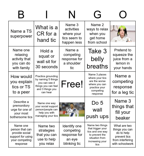 This bingo card has 3 images, a free space and 24 words: Do 5 wall push ups, Practice holding a competing response for 1 minute, Take 3 belly breaths, Identify one competing response for an eye blinking tic, Name one relaxing activity that you can do with family, Name 3 activities where your tics seem to happen less, What is a CR for a hand tic, Describe a premonitory urge for one of your most bothersome tics, Name 3 places where your tics are the worse where you can practice your competing response, Name 3 things that fill your beaker, How would you explain tics or TS to a peer, Name 2 ways to relax when you get home from school, Name one person that can provide social support for using your competing response, Name two strategies that you can use to help you relax, Pretend to squeeze the juice from a lemon in your hands, How do you know when your beaker is getting full, Hold a squat or wall sit for 30 seconds, Name a competing response for a shoulder tic, Name one way your social support person/people can help you with managing your tics, Name a TS superpower, Name a competing response for a leg tic, Name two things that trigger your tics and one way to prevent the situation from increasing your tics, Practice grounding by naming 5 things you can see 4 things you can feel and 3 things you can hear and What are two things you can do to help prevent tics from interfering with schoolwork.